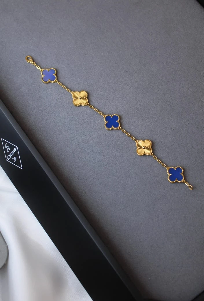 Embrace timeless elegance with the Van Cleef & Arpels 5 Motif Bracelet, a stunning piece that harmoniously blends vibrant blue agate with lustrous gold. Each exquisite motif showcases the brand’s iconic Alhambra design, symbolizing luck and enduring beauty.