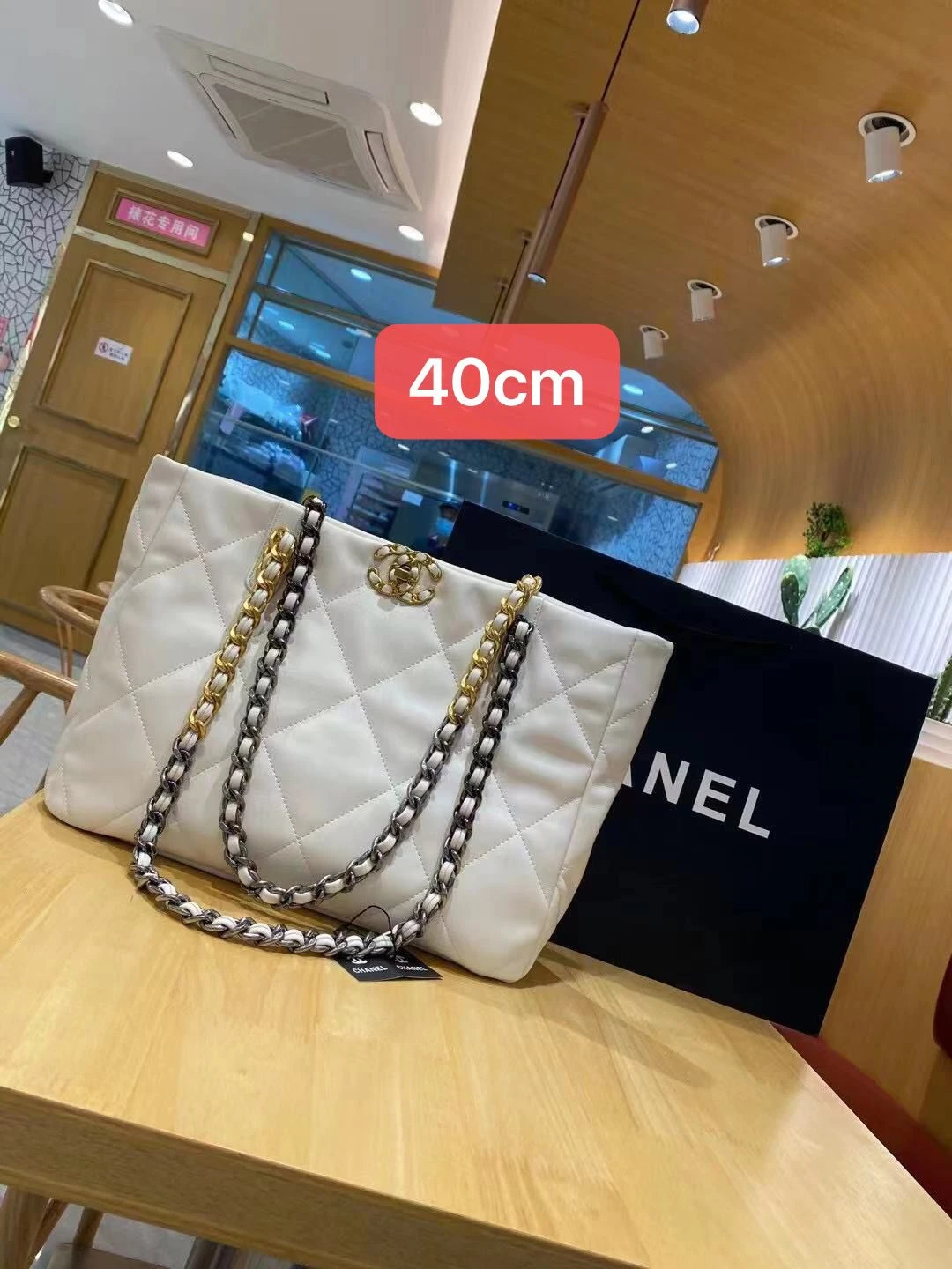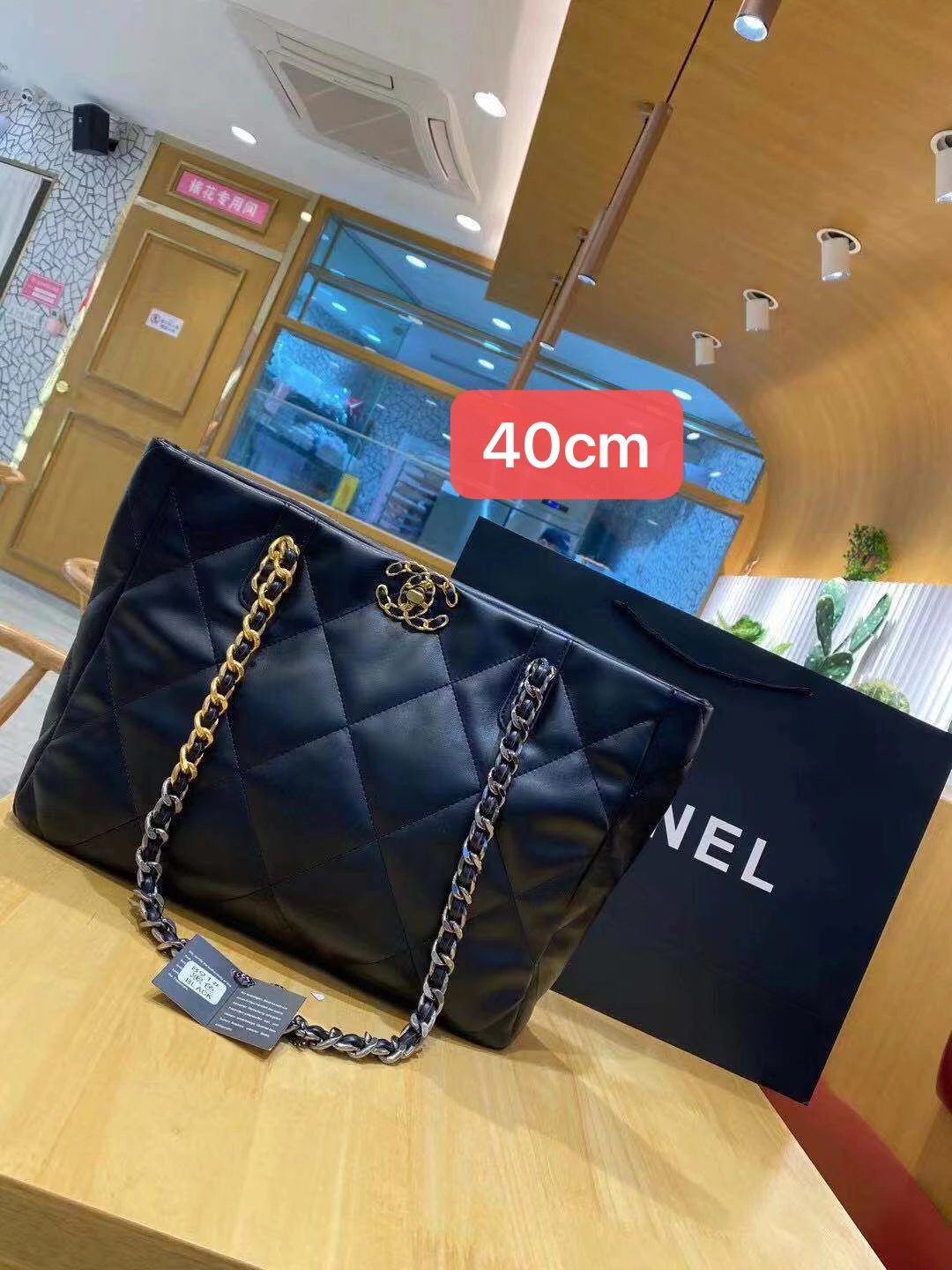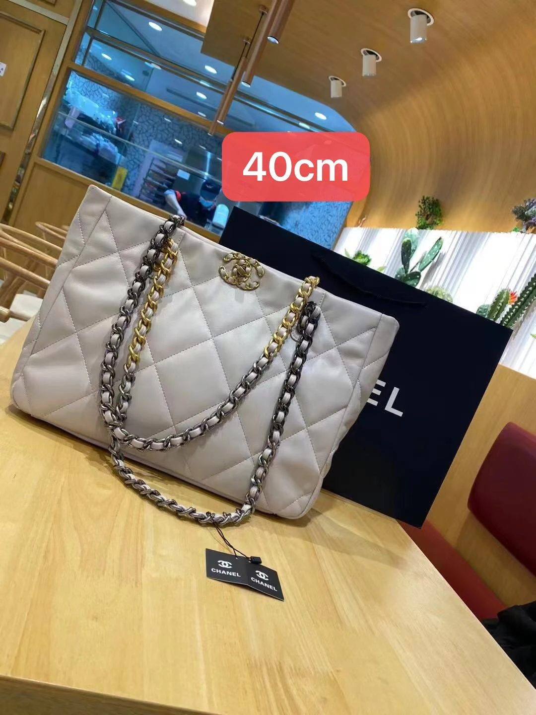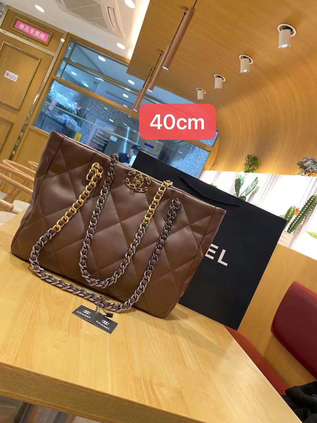 This is an authentic CHANEL Lambskin Quilted Chanel 19 East West Shopping Bag. This stylish tote bag is crafted of diamond-quilted calfskin leather. It features leather threaded chain shoulder straps and a silver chain leather threaded embellished Chanel turn lock on the front. This opens to a brown fabric interior with a zipper pocket
