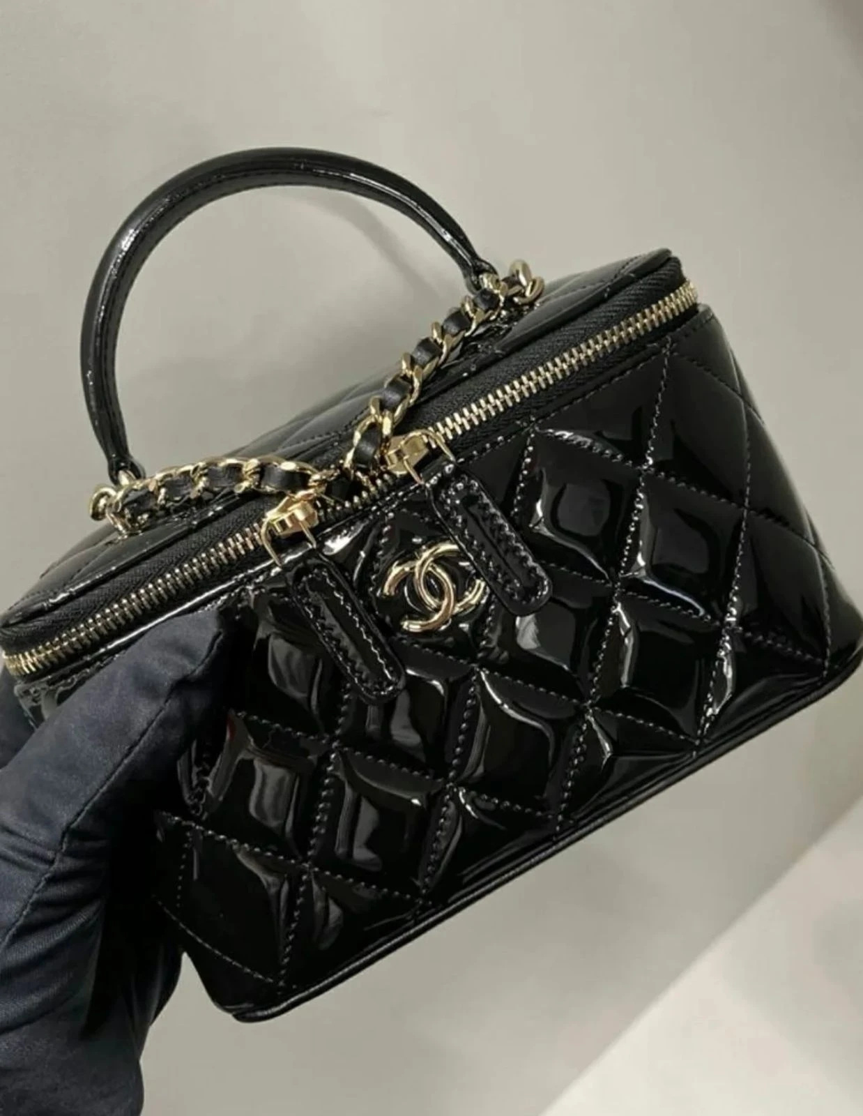TheΒ Chanel Vanity BagΒ in shiny leather is a luxurious and eye-catching accessory that blends timeless elegance with modern allure. Crafted from high-gloss leather, this bag exudes a sleek, polished finish that catches the light beautifully, making it a standout piece.
