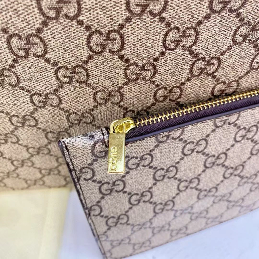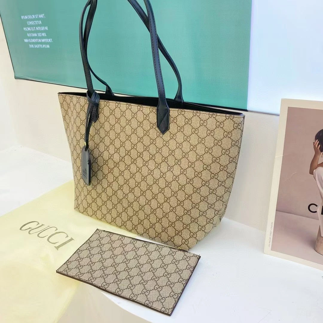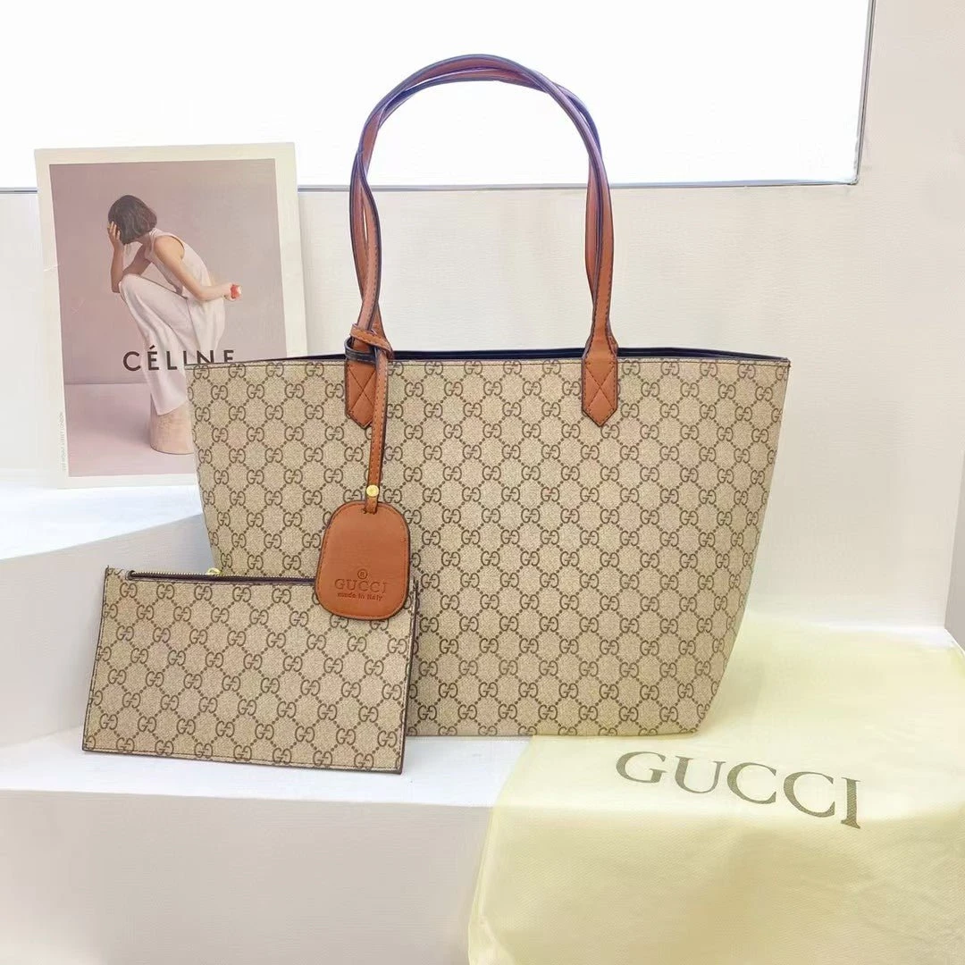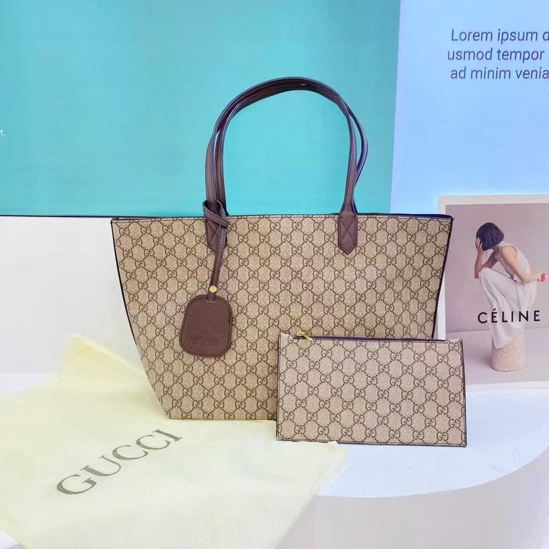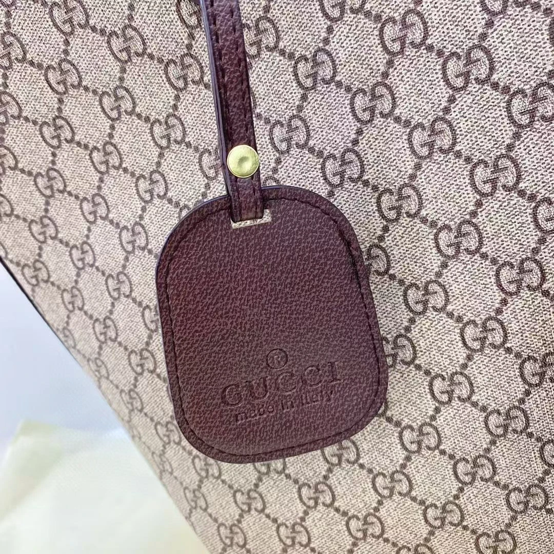 Ophidia GG medium tote from Gucci. Beige and ebony soft GG Supreme coated microfiber fabric with brown leather trim. Antique gold-toned hardware. The soft construction of this bag allows it to be folded horizontally. Double leather handles. Microfiber lining with a suede-like finish.