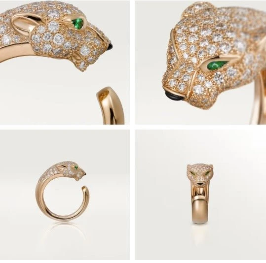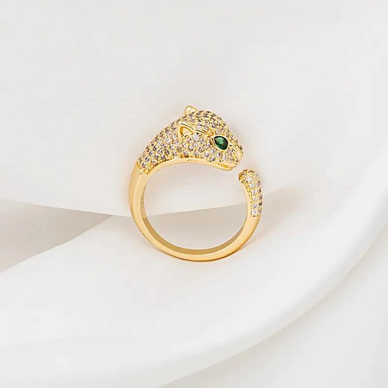 Dazzling green gem eyes and a sparkling head make up this gorgeous jaguar cuff ring.