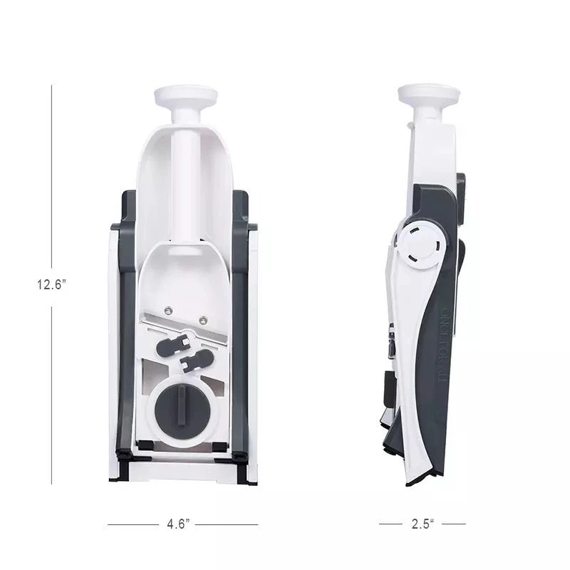 - ▶【Portable PERFECT DESIGN】Our slicer vegetable cutter can retractable handle and folding bracket make adjustable vegetable cutter more space–saving,portable and easy to storage.Replaceable stainless steel blades hidden inside the machine to prevent injury.Independent delivery pusher can push all the vegetables and fruits into the cut to prevent waste.The bottom of the cutter has suction cup feet to ensure stability when in use.