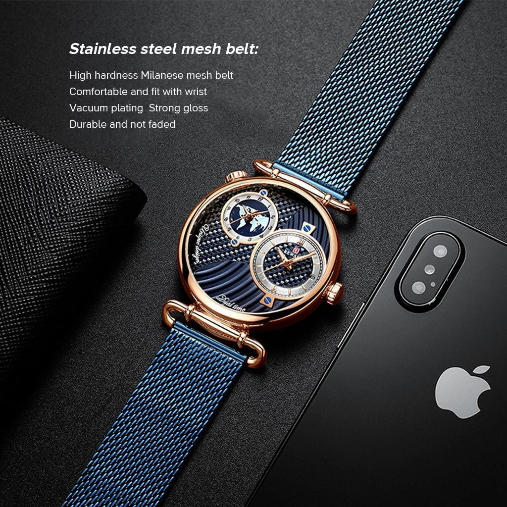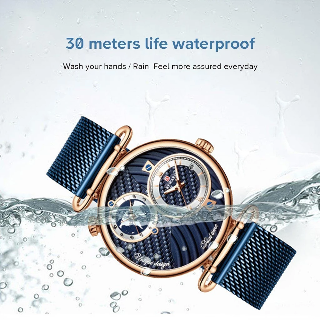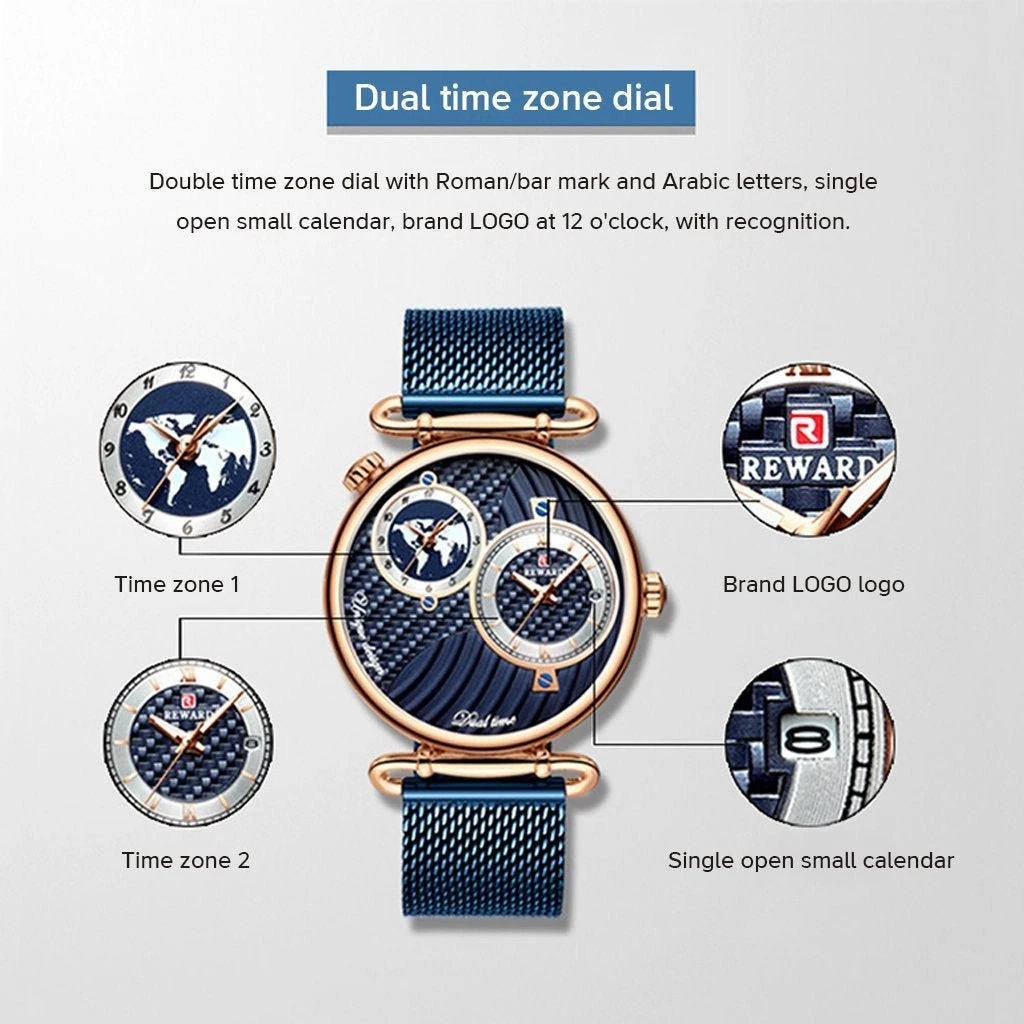 Color:Rose shell blue dial blue belt Gold shell gold dial gold belt Parameter: Dial diameter: 44mm Case thickness: 11mm Strap width: 22mm Strap length: 240mm Product net weight: 99g Product movement: Japanese quartz movement Mirror material: mineral tempered glass Case material: high quality alloy Strap material: steel belt Waterproof rating: 30 meters Plating type: environmental vacuum plating Dual time zone dial Single open small calendar Corrugated surface Mineral tempered glass Stainless steel waterproof bottom cover Stainless steel mesh belt(Durable and not faded) Luminous design